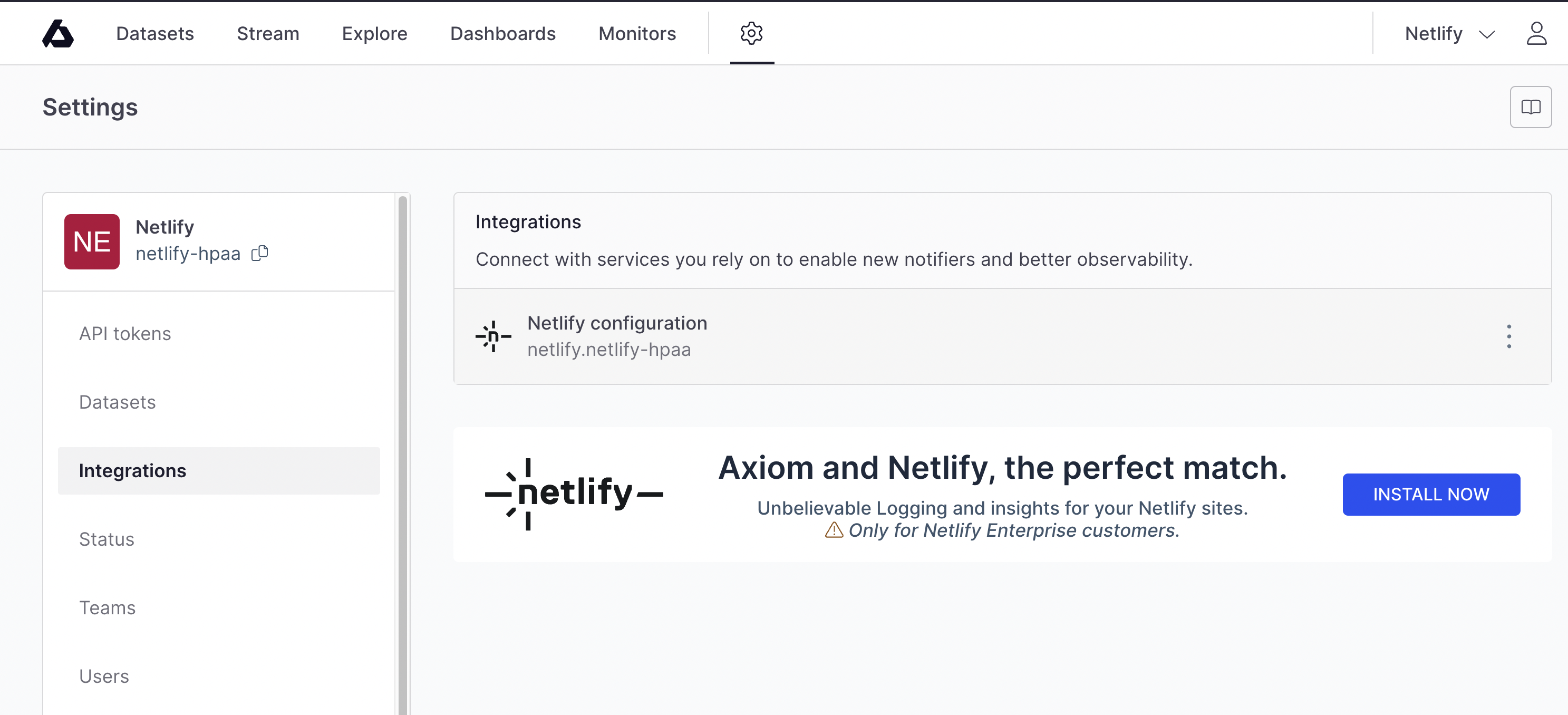 The log events gotten from Axiom gives you better insight into the state of your Netlify sites environment so that you can easily monitor traffic volume, website configurations, function logs, resource usage, and more.- Simply login to your Axiom account, click on Apps from the Settings menu, select the Netlify app and click on Install now.