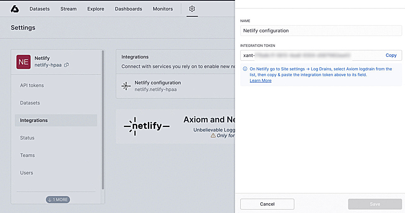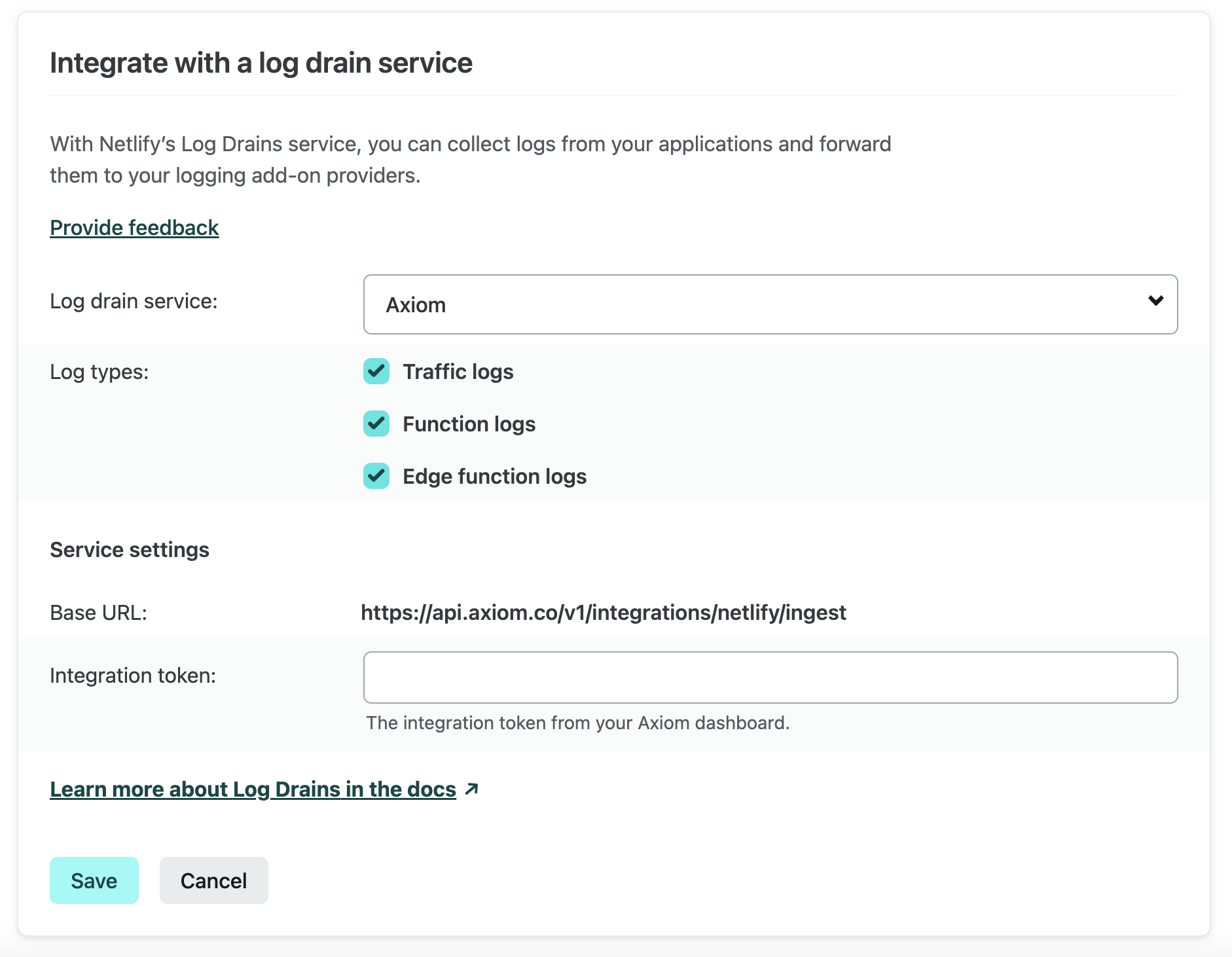 Netlify is a platform for building highly-performant and dynamic websites, e-commerce stores, and web apps. Netlify automatically builds your site and deploys it across its global edge network. The Netlify platform provides teams everything they need to take modern web projects from the first preview to full production.Sending logs to Axiom