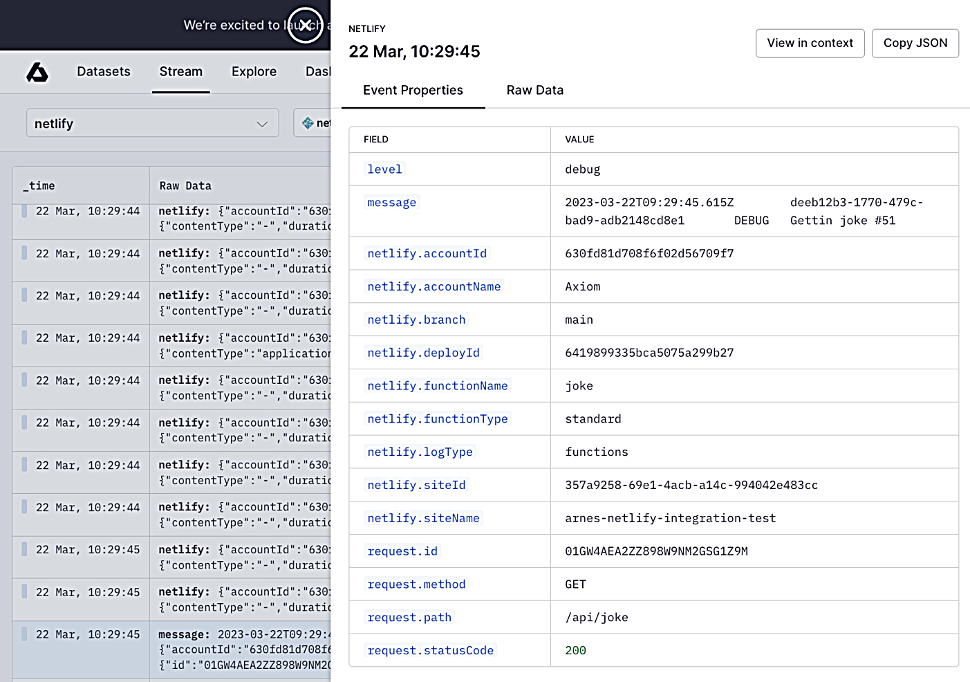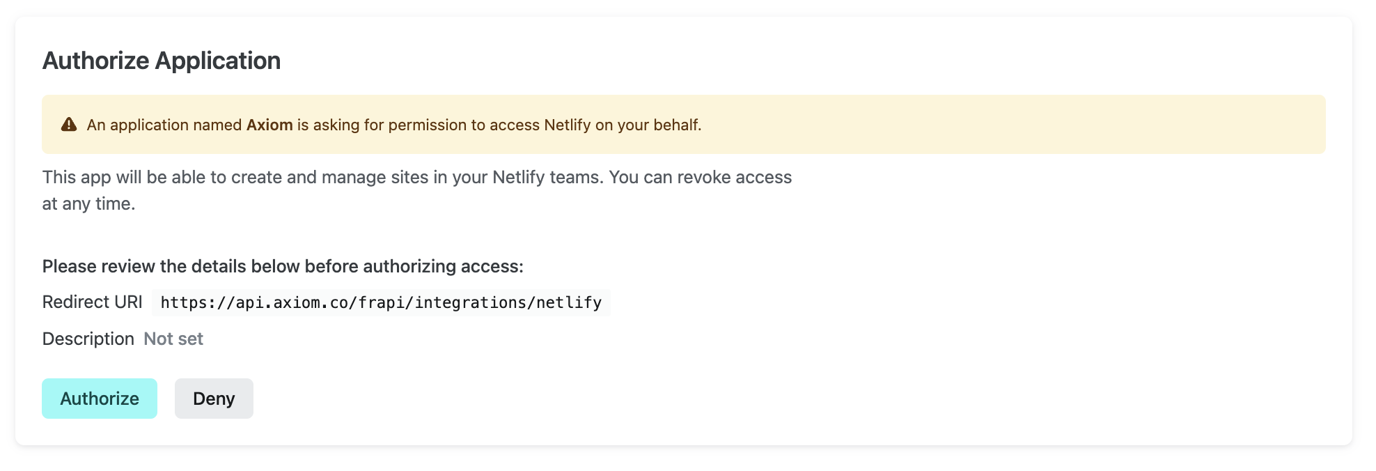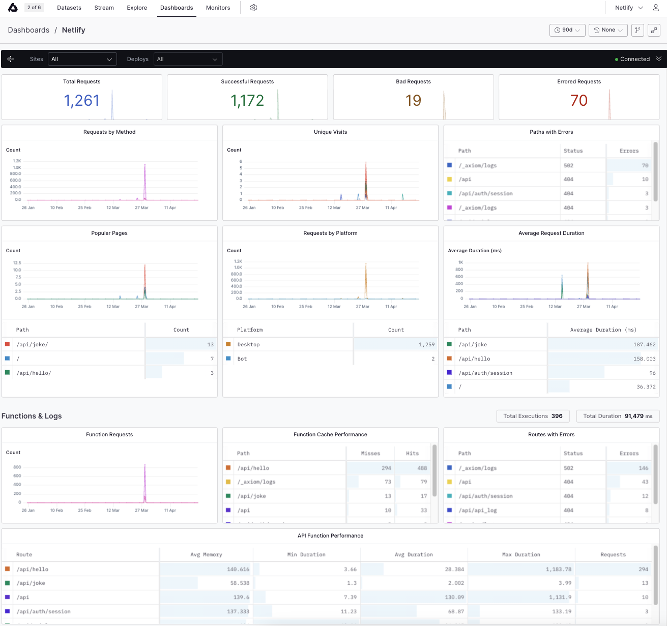Axiom Netlify integration allows you to monitor, and log all of your sites, and apps in one place. With the Axiom app, you can quickly detect site errors, and get high-level insights into your Netlify projects.- We welcome ideas, feedback, and collaboration, join us in our Discord Community to share them with us.